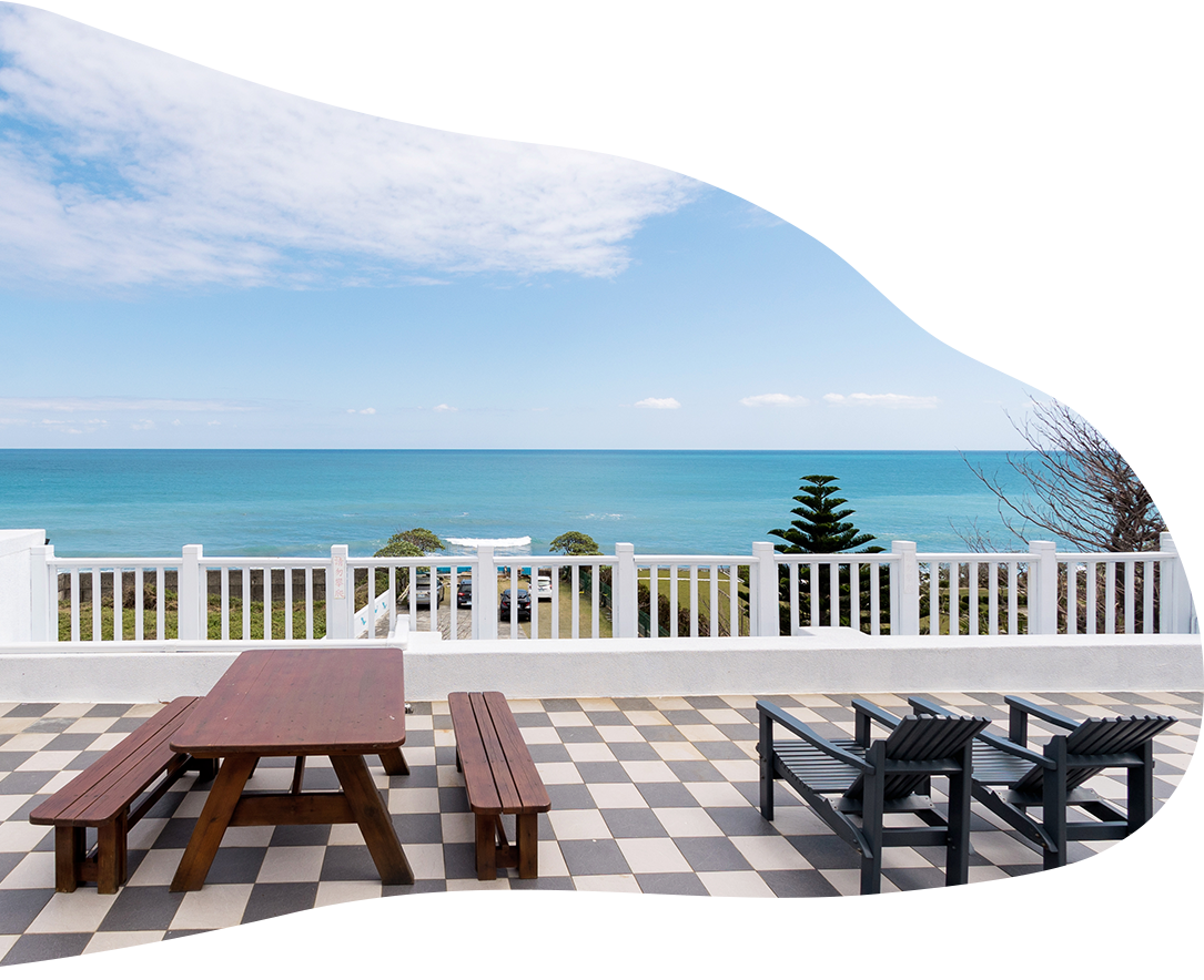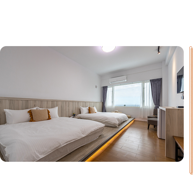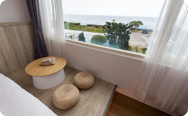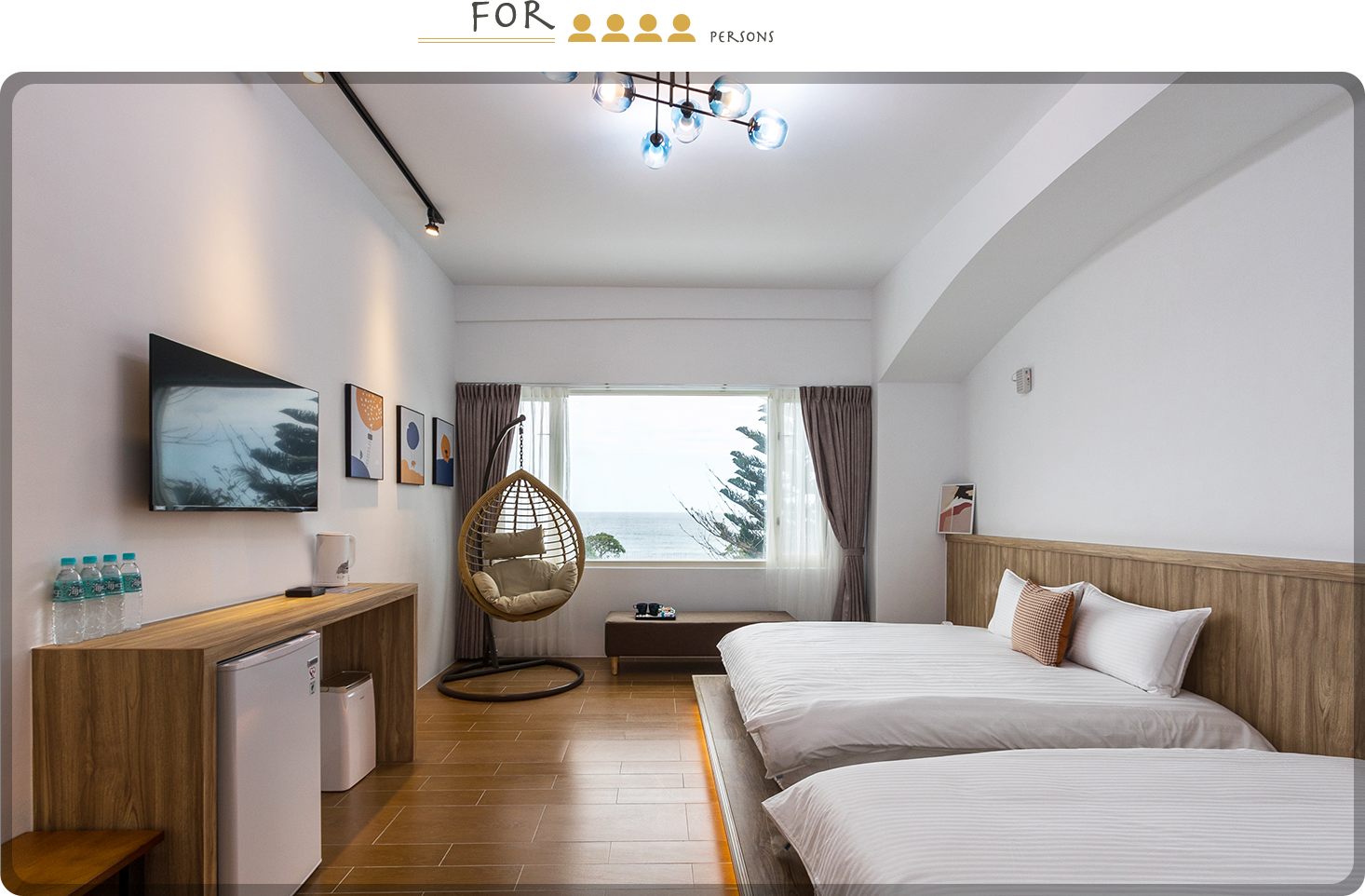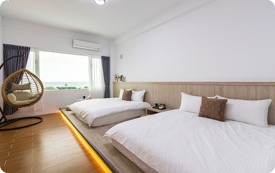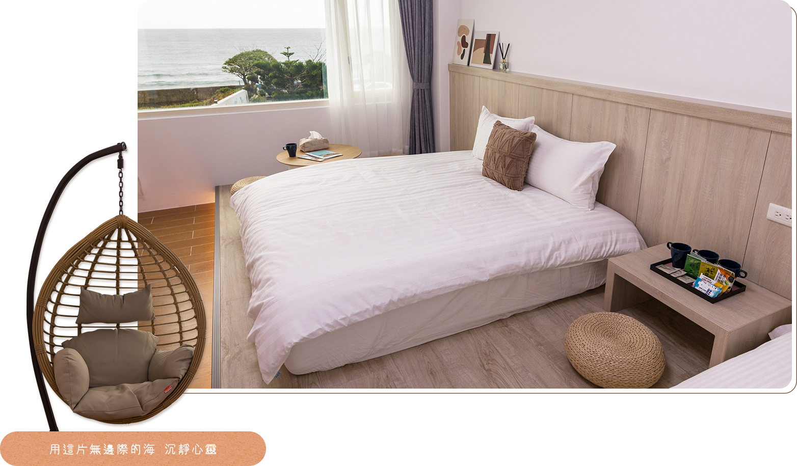 這裡 離海又更近一點了 房裡 貼心提供了一座懶人吊椅在窗邊 坐這 可撇除風吹日曬的困擾 此時 自在的閱讀一本書 喝一杯茶 享受 這份無價的愜意時光 另外 此棟的頂樓有寬敞的戶外看台區 白日的無敵海景 夜晚的浩瀚星空 正是瞰海最讓人無法忘懷的記憶