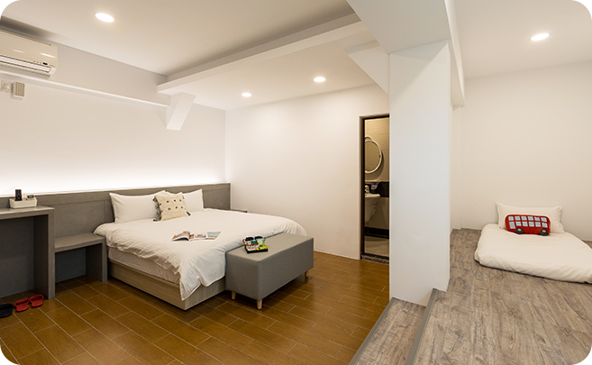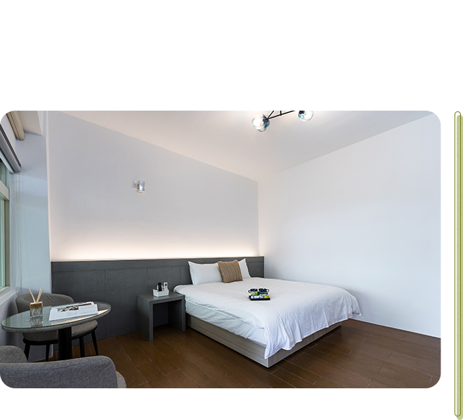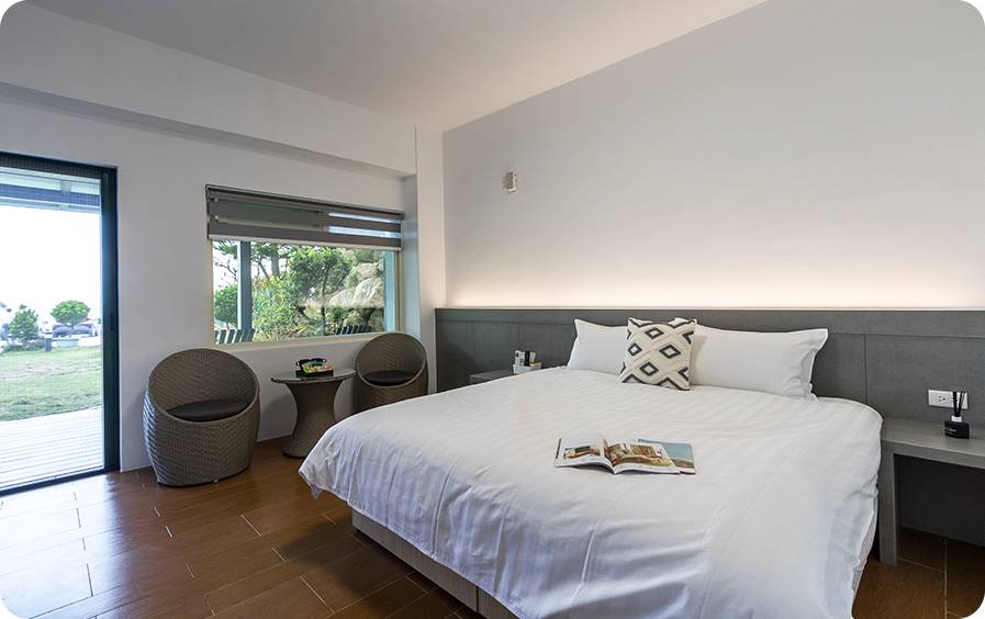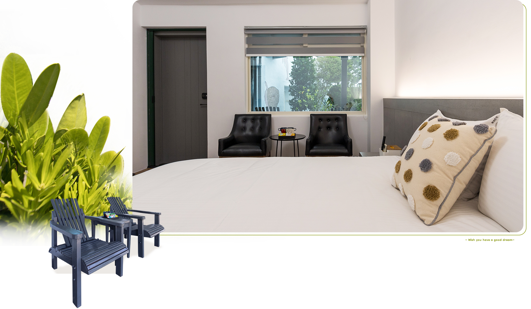 D棟設有小型庭園造景 營造出獨樹一格的私人小天地 房間門口備有躺椅 無論何時 慵懶的躺在這 享受海風 溫柔的吹拂 舒緩身軀 徹底釋放 此外這區有個小小貼心之處~ 若有行動不便的長者或旅伴 這區算是免除爬樓梯的友善房型 若想看海 直線步行即可達成